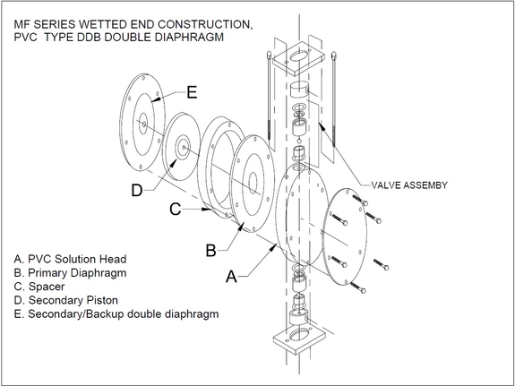 The DDB design adds a spacer and another, backup/secondary diaphragm to the chemical pump’s wetted end to ensure the corrosive chemical, like caustic soda, never reaches inside and damages the pump’s interior components. This is one big reason why when properly maintained, there are Madden metering pumps out there that have lasted for over 25 years with only minor wetted end parts replacements.
